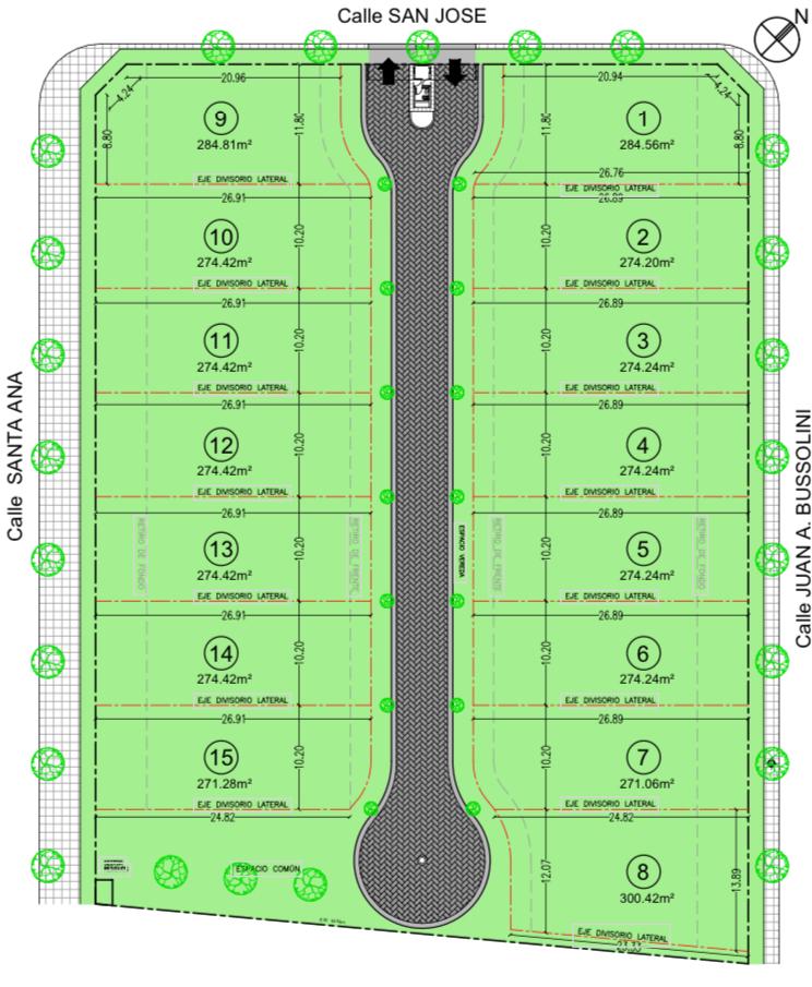 El proyecto se dividirá en 15 lotes con superficies que varían desde 274,24m² hasta el